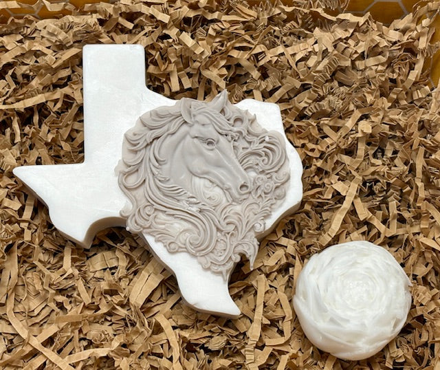 Our extra large Texas-shaped goatβs milk soap is a true statement piece, weighing in at 5.38 oz. Featuring an intricately detailed horseβs head design, this bar celebrates Texas spirit with artisan craftsmanship. Infused with the crisp, uplifting scent of bergamot, it delivers a refreshing lather while nourishing your skin with the creamy richness of goatβs milk.